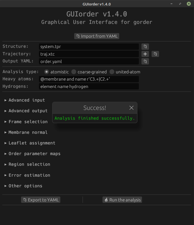 Once (or if) the analysis finishes successfully, a window titled Success! will appear. The output files are then written normally, and you can check them out. You can modify the input parameters and rerun the analysis, export the input parameters into a configuration file by pressing the Export to YAML button (very useful for reusability), or simply exit the application.