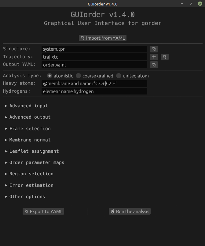 In this example, we first fill in the Structure, Trajectory, and Output YAML fields, which are required. We then fill in the required parameters for the analysis type. Using the radio buttons, you can select between calculating order parameters for atomistic, coarse-grained, and united-atom systems.