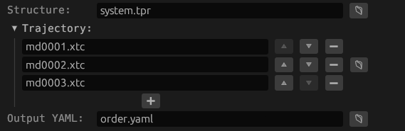 Here, we have specified three trajectory files to analyze. To change their order, you can use the ^ and ⌄ buttons. To remove a file from the list, press the − button next to the field. You can also add more files by pressing the + button, now positioned below.