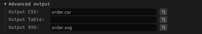 Currently, we are only writing the order parameters into the output YAML file. But we would also like to write them into a CSV file and XVG files. To do that, we click on the Advanced output section, expanding it, and fill in the file names.