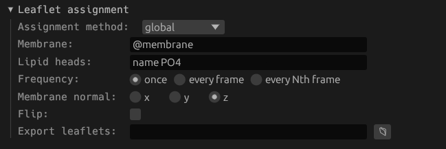 Another advanced configuration we want to provide is region selection. If we expand the Region selection section, we see that, as with leaflet assignment, no region is selected by default, i.e., the entire system is analyzed.