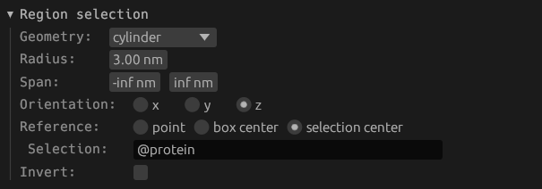 We can change that by selecting the appropriate geometric shape using which we want to specify the region of interest. Here, we select the cylinder and provide parameters for it (see this section of the manual for more details about region selection).