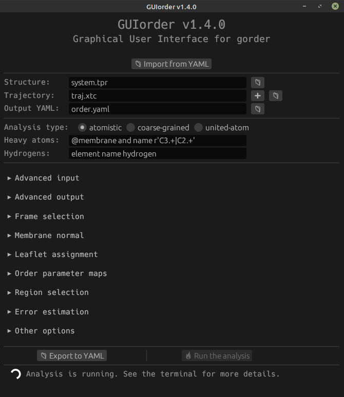 When you press the Run the analysis button, a spinner with the text "Analysis is running. See the terminal for more details." will appear below the last two buttons. GUIorder does not provide any information about the progress of the analysis itself, but this information is written into the terminal as in a normal gorder run (that is because internally, GUIorder invokes gorder and just provides it with input parameters for the analysis).