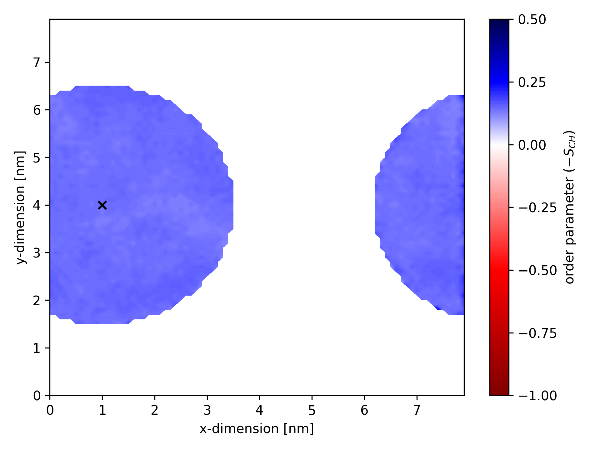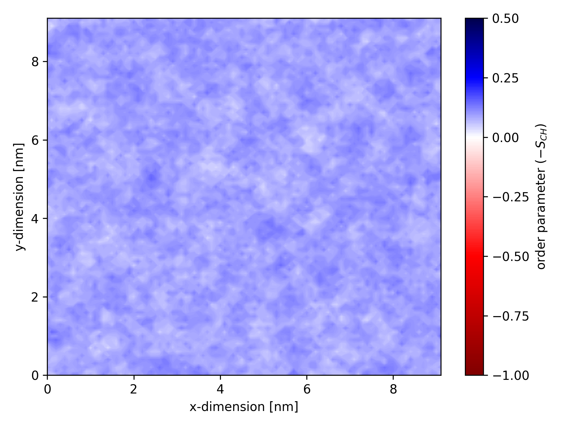 where is the angle between the C-H bond vector and the bilayer normal, and the angular brackets represent molecular and temporal ensemble averages. The order parameter for atomistic systems is usually reported as the negative of this calculated value, (often denoted as or ). Higher positive values of indicate more ordered membrane structures.